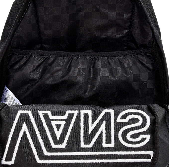 • Black canvas colorway with large white stitched Vans logo on front panel.